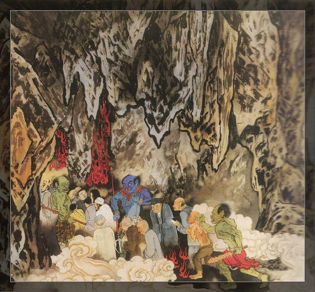 地狱之中,随时可见成千上万夜叉厉鬼,血口钢牙,眼如电光,利爪如钢铁,箝制罪犯,押解拖放至各大小地狱。 此类夜叉厉鬼,无一不是自己业力显相;凶残恶毒,无不是怨憎心而起现形,今往何地狱受何酷刑,一一皆是造罪之加倍数呈现,绝非阎罗天子之设定,而是良心之谴责。