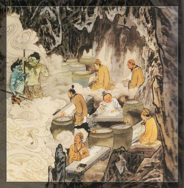 迷朦光中,几个青面差使,押解一批罪犯,在寒铁山洞穴中穿梭而过。这批罪犯,个个衣冠楚楚,看得出其生前之显赫与荣耀,从服饰穿着来看,有不同的阶级与地位;有的应该是政客,有的应是掌有权位的学者,在他们的神色之间,根据然残留几分得意与跋扈。孱杂人群中也有宗教人士、神职道侣,享尽人间一切福报,辜负众生之供养。此时个个神情凝重,似乎已嗅到“大事不妙”的气息。