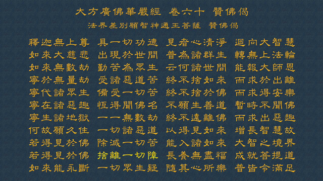 第一、灭五无间罪。 经云:“或复有人。以深信心。于此大愿。受持读诵。乃至书写一四句偈。速能除灭五无间业。”就算是造了五无间恶业的人,能够以深信心、精进心、希有心读诵这部经典 ,五无间地狱的果报都能够迅速除灭。 第二、灭疾病烦恼。 《华严经》 里面所记载的功德,以深信心、精进心、稀有心受持读诵,甚至书写一四句偈,一切生理上的疾病、心理上的疾病、所有的苦恼,都能一下子消除了。 第三、往生人天善处。 普贤菩萨勾画了一幅长卷:“若生人天。所在之处。常居胜族。悉能破坏一切恶趣。悉能远离一切恶友。悉能制伏一切外道。悉能解脱一切烦恼。如师子王摧伏群兽。堪受一切众生供养。”读诵《华严经》的人,悉能解脱一切烦恼,往生善趣。 第四、降伏魔怨。 受持《华严经》的功德,使鬼魅魍魉都远离功德主,或者他们被受持《华严经》的功德所感召,暗地里亲近,赞叹,礼拜,守护功德主。 第五、一切如意。 受持《华严经》的这个人,在生的时候,十方三世的一切诸佛菩萨都称赞这个人了不起,十方三世的一切诸佛菩萨都发心守护能受持《华严经》的人。