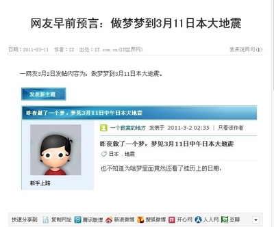 3月2日,一位大陆网友在论坛上发文说,梦见3月11日中午东京大地震。