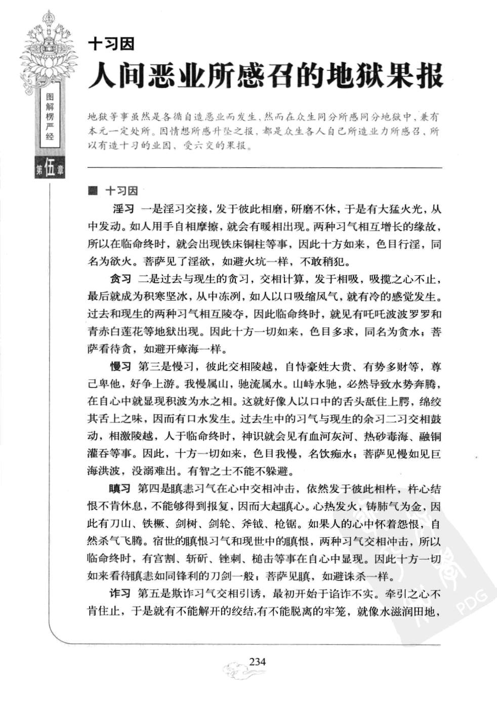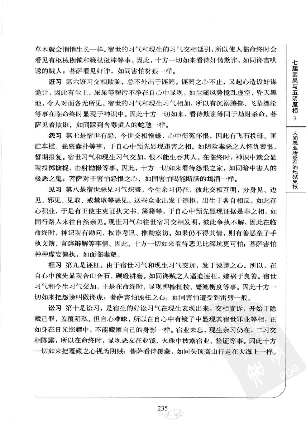 八、见习第八是宿世恶见习气炽盛,今生余习仍在,彼此交相互明,分身见、边见、邪见、见取、戒禁取等恶见。这些众业出发于违拒,出生于各自相反,如此存心积业,于是有王使主吏证执文书、簿籍等,于自心中预先显现证据是非之相,如同行路人来往自然亲见。现世习气和往世宿习交相发明,彼此争执不解,因此在临命终时,神识现有勘问、权诈考讯、推鞫察访。如果仍不得其情,则有善恶童子手执文薄、言辞辩解等事情。因此,十方一切如来看待恶见比深坑更可怕;菩萨害怕种种虚妄偏执,如面临毒壑.