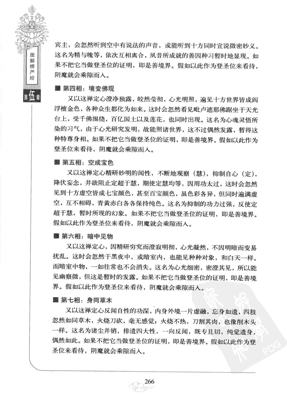 行者处于色阴区宇中,对种种境界能够不把它当做登圣位的证明,不起执著心,那就是色阴将破的吉祥之兆。假如贪著种种境界,以此作为登圣位来看待,阴魔就会乘隙而入。 色阴区宇的境界佛对阿难说,你应当知道,你坐道场时,销落一切心念。心念若是尽时,那么这离念之心,本具根性,即时显现,一切时,一切处,精而不杂,明而不昧。动静不移,忆忘如一。当其住于此处,入三摩提,正如明目的人处于大幽暗中,虽然六精之性的妙净明心本来周遍法界,无奈色阴未开,心光未发,这时名为色阴区宇。如果目的明白朗照,内彻五脏百骸,外彻山河大地,虽然未能圆鉴大千,而眼前十方所有之处,没有不洞达开通的,不再幽暗,就称为色阴尽。这个人从此能超越劫浊。观看色阴所生起的缘由,是以坚固妄想作为它的根本的。 第一相:身能出碍在这色阴区宇之中,精研妙明之时,妄想不起定力增强,于是内外四大虚融,如云如影,不再密织而成坚实。顷刻之间,这色身就能穿墙透壁,无所障碍,这名为心精妙明流溢于当前根、尘坚实之境,由于定力的逼使,暂得虚融之相,稍懈即失。如果不把它当做登圣位的证明,即是善境界。假如以此作为登圣来看待,阴魔就会乘隙而入。 第二相:内彻拾虫复次,以这禅定心精研妙明之时,反闻功深,光明内照,身中莹彻,此人忽然于自身内拾出蛲蛔等虫,而身体完好,毫无毁伤,这就名叫心精妙明流溢于形体,使五脏虚融,四肢透彻。这不过是精研功行的逼拶,暂得身内莹彻。如果不把它当做登圣位的证明,即是善境界。假如以此作为登圣位来看待,阴魔就会乘隙而入。 第三相:精魄离合又以这禅定心,精研内身、外境,悉皆虚融,定力增胜,这时魂、魄、意志、精、神等,除却能感受的身体不改常态外,其他皆交相涉入,互为宾主,会忽然听到空中有说法的声音,或能听到十方同时宣说微密妙义。这名为精与魄等,依次互相离合,夙昔所成就的善因种习暂时地显现。如果不把它当做登圣位的证明,即是善境界。假如以此作为登圣位来看待,阴魔就会乘隙而入。 第四相:境变佛现又以这禅定心澄净独露,皎然莹彻,心光明照,遍见十方世界皆成阎浮檀金色,各种众生都化为如来。这时会忽然看见毗卢遮那佛踞坐于天光台上,受千佛围绕,百亿国土以及莲花,也同时出现。这名为心魂灵悟所染的习气,由于心光研究发明,故能照诸世界,这不过偶然发露,暂得这种特尊身相。如果不把它当做登圣位的证明,即是善境界。假如以此作为登圣位来看待,阴魔就会乘隙而入。 第五相:空成宝色又以这禅定心精研妙明的闻性,不断地观察(慧),抑制自心(定),降伏妄念,并欲阻止定超于慧,期使定慈均等,因用功太过,这时会忽然见到十方虚空皆成七宝颜色,甚至百宝颇色,虽色彩各异,但同时遍满虚空,互不相碍,青黄赤白各各保持纯色。这名为抑制的功力过强,反使定超于慧,暂时所现的幻象。如果不把它当做登圣位的证明,即是善境界。假如以此作为登圣位来看待,阴魔就会乘隙而人。 第六相:暗中见物又以这禅定心,因精研穷究而澄寂明彻,心光凝然,不因明暗而变易扰乱。这时会忽然于黑夜中,或暗室内,也能见种种对象,和白天一样。而暗室中物,一如往常也不会消失。这名为心光细密,密澄其见,所以能见幽察微,但这是暂时的发露。如果不把它当做登圣位的证明,即是善境界。假如以此作为登圣位来看待,阴魔就会乘隙而入。 第七相:身同草木又以这禅定心反闻自性的功深,内身外境一片虚融,忘身如遗,四肢忽然如同草木,火烧刀砍,毫无感觉;火烧不热,刀割其肉,也像削木头一样。这名为诸尘并销,排遣四大性,一向反闻,既专且切,纯觉遗身,偶然如此。如果不把它当做登圣位的证明,即是善境界。假如以此作为登圣位来看待,阴魔就会乘隙而入。 第八相:遍见无碍又以这禅定心精研妙明,成就清净之心,净心观照之功到达极点,因而净极光通,会忽见十方大地山河皆成佛国,七宝具足,光明遍照。又见恒河沙数诸佛遍满空界,宫殿楼阁庄严华丽,无与伦比。下视地狱,上观天宫,毫无障碍。这名为听说净秽二土,随着而起欣上厌下的凝想,日久想深所化成,今于定中,偶然影现,虽似实魂,仍同幻化。如果不把它当做登圣位的证明,即是善境界。假如以此作为登圣位来看待,阴魔就会乘隙而入。 第九相:遥见遥闻又以这禅定心穷究至极深远之处,色境已不能为碍,忽于中夜遥见远方的市井街巷,亲族眷属历历分明,或听到他们交谈共语。这名为禅定迫心,迫到极处致令心光外射,故多能隔物可见可闻,然这只是暂现光景。如果不把它当做登圣位的证明,即是善境界。假如以此作为登圣位来看待,阴魔就会乘隙而入。 第十相:妄见妄说又以这禅定心,穷究到至精至极境地,色阴将破而未破之时,魔宫震动,魔心恼怒,必多方扰乱。行者这时会见自身作善知识,形体也随时变易,或作佛身,或化菩萨身等,无缘无故作种种变迁,顷刻不停。这名为心中本含藏有的魑魅邪妄种子在定中发现,原属虚妄不实。有的是天魔乘隙进入行者心腹,把持他的心神无端说法,并启发他的狂慧,使他通达高深的理论,这完全是魔力的使然,并不是自己真正心得开悟。若不作证圣果想,生欢喜心,魔事自然消失;若作证圣果解,便会被群邪所惑,无可哀救。 对色阴魔事的总结以上所说,禅中所现的十种境界,都是行者于色阴中,见理不曾透彻,正定没有达到精纯,不过是禅观与妄想,两相