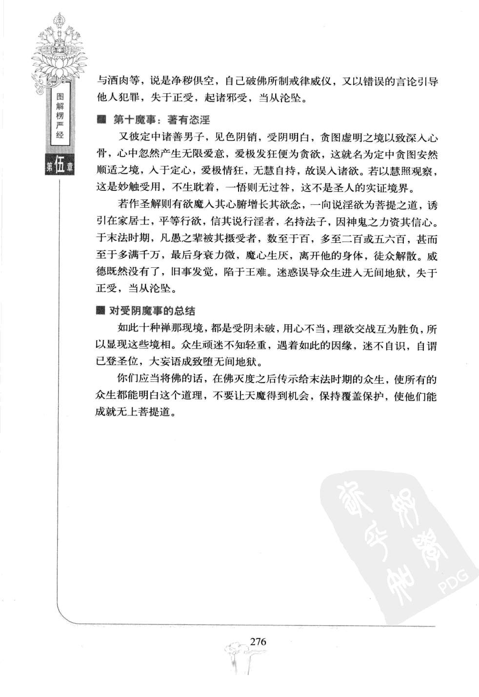 色阴区宇所现十境次第相生。受阴十境随缘个别显现,不出苦、乐、忧、喜、舍五相。觉悟之后,随缘利生,不失正受,就没有过失。当误以为是证入圣位的证明,狂妄自大,易沦为魔眷而堕落。 受阴区宇的境界佛说,彼善男子继续精研,在修三摩提微密观照中,到了空色俱忘、心光遍圆的境界,称为色阴尽。看见诸佛的妙觉明心,如同在明镜中显现其像。虽然若有所得,然而还不能取用,犹如梦魇之人,手足仍在,也能见能闻,但心触客邪而身不能动,此时就名为受阴区字。若是魇咎销歇,自心脱离色身,能够反观自己的面目,此时来去自由,色身不能成为阻碍,就名为受阴尽。至此,此人即能超越见浊,回观受阴之所由生,是因虚明妄想为其本源。 第一魔事:抑己悲生善男子在禅定中,在色阴已尽,受阴未破之时,得大光耀,自见己心和佛心相同,深自刻责不度众生。刻责过分以致忘于正受,忽然在有众生处发出无穷悲悯,凡见一切,乃至看见蚊虻都好像自己的赤子一样心生怜悯,不觉流泪,这就名为有功用心抑责摧伤过分所显的现象。觉悟之后,随缘利生,不失正受,就没有过失,这不是证入圣位的证明。觉了不迷,渐悟渐止,还复正念,久自消歇。 若作为已证得诸佛的同体大悲来看待,则有悲魔入其心腑,见人则悲,啼泣无限,由此起诸颠倒,故失于正受,非但不能增进,当从沦坠。 第二魔事:扬己齐佛又彼定中诸善男子,见色阴已销,受阴虚明,殊胜境界现前,感激之心过分,忽于自己心中,生无限勇,自觉立地可以成佛。自谓三大阿僧祇劫,一念可以超越。这就名为有功用心太锐,志欲陵跨佛乘,未免过分超越,故现这种暂时的现象。觉了不迷,这种现象久了自然消歇。如果误以为已登圣位,就会有狂魔入其心腑,见人则骄慢自夸,傲慢无比,其心甚而至于上不见佛,下不见人,失于正受,起诸邪见,当从沦坠。 第三魔事:定偏多忆又彼定中诸善男子,见色阴已销,受阴明白,不能进破受阴,前无新证;要想仍回色身,然而色阴已销,无可依托。定强慧弱,智力衰微,自处两楹中间,灰心泯志,入中隳地,不见有一事可作,心中枯蝎,于一切时中沉忆不散,误认此即勤精进相。这就名为修心偏用定力,没有智慧相资,自失方便。觉悟了就没有什么过失,不能作为登圣位的证明。若作圣解,就会有忆魔入其心腑,早晚撮心,系于一处,失于正受,当从沦坠。 第四魔事:慧偏多狂又彼定中诸善男子,见色阴已销,受阴明白,见胜相现前,慧力过定者,失于过猛过利。见自心即是佛心,以此怀于心,过于尊重己灵,故疑自心即是卢舍那如来,得少为足。这是亡失恒常审察自己分位,一味溺于悟证知见,了悟即无过失,悟则无咎,仍然增修本定,这并不是进入圣位的证明。若自误以为已登圣位,就会有下劣易知足魔入其心腑。见人自说我得无上第一义谛,失于正受,当从沦坠。 第五魔事:历险生忧又彼定中诸善男子,见色阴已销,受阴明白,新证未获得,从前的故心已灭,历观前后二边际相,感到前途艰险,心中忽然生出无尽的忧虑,如坐铁床,如饮毒药,心中不想活,常求别人害他的命,早希望得到解脱,这就名为修行失于智慧观照的方便,悟知改过忘忧,则无过咎,自可复归本修,这不是圣证境界。若作圣解,则有一分常忧愁魔,入其心腑,济其忧愁,手执刀剑,自割其肉,乐其舍寿速死。或常怀优愁,走入山林,深厌世间,不耐见人,此心为魔习所熏,不能自返,故致失于正受,当从沦坠。 第六魔事:觉安生喜又彼定中,诸善男子,见色阴销,受阴明白,处清净中,内心宁谧,自觉安妥稳顺,忽然自有无限喜生,心中欢悦不能自止,这就名为轻安无慧自禁,悟之不以为喜,急寻本修,即无过失,不是圣证。 若作圣解,则有一分好喜乐魔入其心腑,见人即笑,于通衢道路之旁,自歌自舞,毫无忌惮,自谓已得无碍解脱。失于正受,当从沦坠。 第七魔事:见胜成慢又彼定中诸善男子,见色阴销,受阴明白,自谓已得满足,忽然无端心中生出大我慢,如此甚而至于单慢、过慢、慢过慢、增上慢、卑劣慢等七种过慢并发,心中甚至于轻视十方如来,何况下位菩萨以及声闻、缘觉,这就名为惟见己灵尊胜,慢气所使,且无智慧自救其病。如果能用慧照观察,观察种种法性平等,尚且不见有众生可怠慢,哪里敢慢十方圣贤?这不是圣人的实证境界,觉悟后诸慢自销。 若作圣解,则有一分大我慢魔入其心腑,资益其邪慢,不礼塔庙,摧毁经像。假设遇到檀越谏阻,就说:佛像是金、铜、土、木,肉身为活佛真常,经典是树叶毡华,自说为向上真宗,不自恭敬,却崇土木,实为颠倒,大言不惭,疑误一切。有深信他说的话的人,跟随他毁碎埋弃地中,造无量罪,魔教害人,入无间狱。失于正受而起邪受,当从沦坠。 第八魔事:慧安自足又彼定中诸善男子,见色阴销,受阴明白,于识精元明之中圆悟至精之理。既见佛心,则得大无碍,莫不随心顺意,心中生出无量轻安,自言成就圣位,得到大自在,这就名为因慧获诸轻安澄清之境,离诸粗重之相。悟则无咎,乘此圆悟之慧,增修本定,自然没有过失。这些境界正堕在受阴区宇之中,故不是圣证。若作圣解,则有一分好轻清魔入其心腑,自觉满足,不求上进,这类人多作无闻比丘,疑误众生,堕阿鼻狱,失于正受,当从沦坠。 第九魔事:著空毁戒又彼定中诸善男子,见色阴销,受阴明白,于明悟中,得虚明性,体观受阴,惟是虚明妄想,于其心中,忽然生起空净之念,永沉断灭,遂致拨无因果,从此不假修为。一向入空,断空之心现前,乃至心中生出