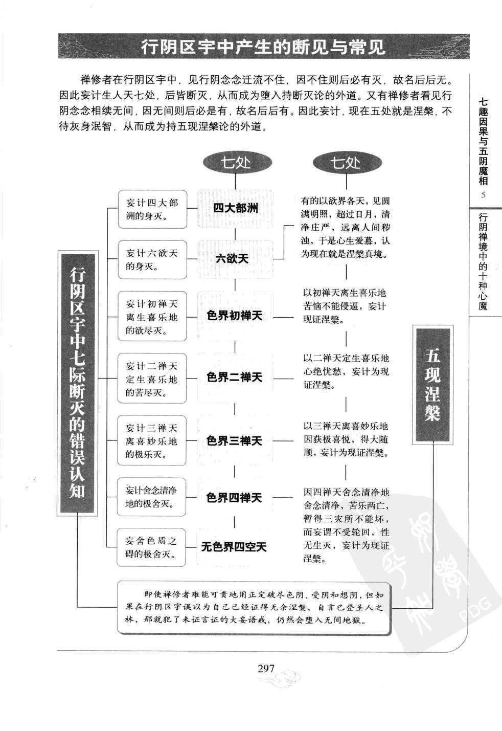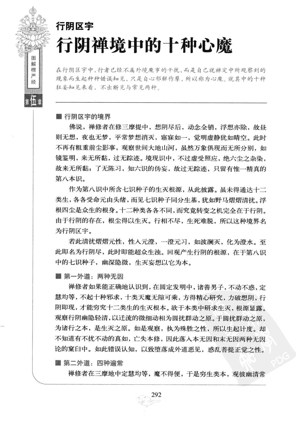 在行阴区宇中,行者已经不属外境魔事的干扰,而是自己就禅定中所观察到的现象而生起种种错误知见,只是自心邪解作孽,所以称为心魔。就其中的十种狂妄知见来看,不出断见与常见两种。 行阴区宇的境界佛说,禅修者在修三摩提中,想阴尽后,动念全销,浮想亦除,故昼则无想,夜也无梦,平常梦想消灭,寤寐如一,觉明虚静犹如晴空。此时不再有粗重前尘影事,观察世间大地山河,虽然万象俱现而无所分别,如镜鉴明,来无所黏,过无踪迹。境现识中,不过虚受照应,绝六尘之杂染,故来无所黏;了无陈习,知六识的伪妄,故过无踪迹,只留有惟一精真的第八本识。 作为第八识中所含七识种子的生灭根源,从此披露。虽未得通达十二类生,各各受命元由头绪,而见七识种子同分生基,犹如野马熠熠清扰。浮根四尘是众生的根身。十二种类各各不同,而究竟转变之机完全在于行阴。由于行阴的存在,根尘得以生灭。行相不尽,生死难脱,所以这种魔界名为行阴区宇。 若此清扰熠熠元性,性入元澄,一橙元习,如波澜灭,化为澄水。至此即名为行阴尽,此时即能超众生浊。回观产生行阴的根源,在于第八识中的七识种子,幽深隐微,生灭妄想以它为本。 第一外道:两种无因禅修者如果能正确地认识到,在圆定发明中,诸善男子,不动不惑,定慧均等,不起十种邪求,十类天魔无隙可乘,方得精心研究,力破想阴,行阴即现,才能穷究十二类生的生灭根本。欲于本类中研求生灭,根源显露。观察行阴幽隐轻清,以迁流的微细动相为圆扰群动之原。于圆扰群动之原,为诸行之本,是生灭之原。如是观察,执为殊胜之性,所以生起计渡。却不知道有不扰不动的真如,亡失本修,因此落入本无因和末无因两种无因论的窠臼中。如此错误认知,以致堕落成外道恶见,惑乱菩提正觉之性。 第二外道:四种遍常禅修者在三摩地中定慧均等,魔不得便,于是穷生类本,观彼幽清常扰动的根源。于圆常中妄起计度之念,以致堕入心境计常、四大计常、八识计常、想尽计常这四遍常论中,堕落成外道,惑乱了菩提正觉自性。 第三外道:四种颠倒禅修者在三摩地中定慧均等,坚凝正心,魔得不到机会。于是禅修者穷尽众生十二类生生灭的深本,观察行阴幽隐轻清,常常现出清扰冲动的生命受生的原动力,自他身心都依它而建立。于自他法中,起种种妄计,禅修者就会堕入双约自他、约他国土、约自身心、双非自他这四种颠倒见中、双计无常和常的见解中,堕落成外道,惑菩提性。 第四外道:四种有边禅修者在三摩地中坚凝正心,魔得不到机会,于是能穷尽众生十二类生的生灭根本。他观察行阴幽隐轻清,常常现出清扰冲动的生命受生的原动力,于是计三际〔过去、现在、未来),计八万劫内外的见闻,计彼我之性,计四明的生灭这四种边见,从而堕入四种有边论中,就成为外道,迷惑了中道的善提正性。 第五外道:四种矫乱禅修者在三摩地中坚凝正心,魔得不到机会,穷尽众生十二类生生灭的深本,观察行阴幽隐轻清,常常现出清扰冲动的生命受生的原动力。禅修者在定中所知所见不能抉择明了,而妄生周遍计度,从而堕入四种颠倒不死的矫乱遍计的虚论中,堕落成外道,迷惑菩提真性。 第六外道:有十六相禅修者在三摩地中坚凝正心,魔不得便。于是,他能穷尽众生十二类生生灭的深本,现察行阴幽隐轻清,常常现出情扰冲动的生命受生的原动力。禅修者用妙明真精观照行阴千流不息之相,产生自我知见后推测计度,而引发十六种有相之见。如此错误地认知,就堕落成外道,迷惑了善提的正性。 第七外道:八种无相禅修者在三摩地中,坚凝正心,魔不得便,于是能穷尽众生十二类生生灭的深本,观察行阴幽隐轻清,常常现出清扰冲动的生命受生的原动力。对于前面已经除灭的前三阴中产生错误认知,人就堕入死后无相的执空颇倒中,就堕落成外道,迷惑了菩提的正性。 第八外道:八种俱非禅修者在三摩地中,坚凝正心,魔不得便,于是能穷尽众生十二类生生灭的深本,观察行阴幽隐轻清,常常现出清扰冲动的生命受生的原动力。由后观前,由前观后,穷尽色、受、想、行四阴界限,有无俱非,成为八种俱非相;也就是非有色、受、想、行,非无色、受、想、行。随举一阴作为研究的对象,都可以说死后非有相、非无相,从而堕落成外道,迷惑菩提的正性。 第九外道:七际断灭禅修者在三摩地中,坚凝正心,魔不得便,穷尽众生十二类生生灭的深本,观察行阴幽隐轻清,常常现出清扰冲动的生命受生的原动力。见行阴念念灭处,生起错误知见,禅修者便坠入处处皆断灭的七处断灭论,错误地认为死后断灭,堕落成为外道,惑菩提种性。 第十外道:五现涅槃禅修者在三摩地中,坚凝正心,魔不得便,穷尽众生十二类生生灭的深本,观察行阴幽隐轻清,常常现出清扰冲动的生命受生的原动力。于行阴念念相续无间的后后有生起错误知见,这人就堕入五涅槃论,把五种有漏之处当成涅槃之地,堕落成外道,迷惑了菩提种性。 对行阴的总结以上所说,禅那中所现的十种狂妄知解(即心魔),都是行者干行阴中,见理不曾透彻,正定没有达到精纯,不过是禅观与妄想,两相交战于心中互为胜负的结果;妄想胜于观照时,就会出现这些邪悟。众生钝顽,迷昧无知,不自揣度思量,我是何根器,遇到这种悟境出现,以迷惑为解悟,自以为已证圣位,这是未证言证,未得言得,成大妄语,以致堕落无间地狱,受无量苦,经无量劫,不得出离。