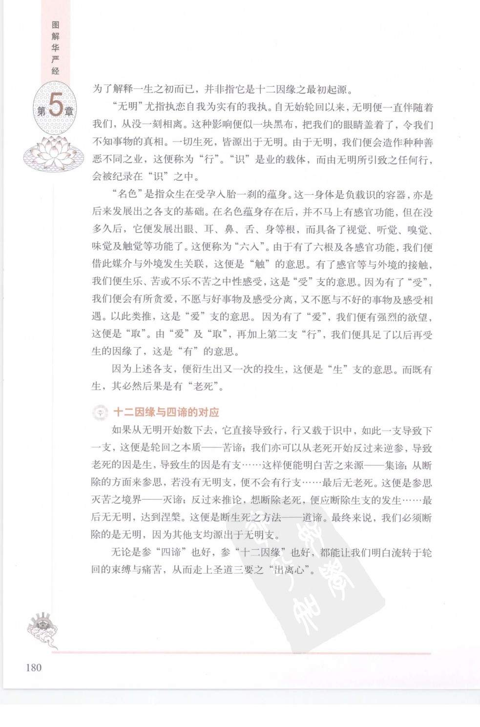 发起出离心的第二种方法参出离心有两种方法,一种为依苦及集谛修,这点我们在前面已大致阐释过:还有一种便是观察“十二因缘”。十二因缘教法,是一套浓缩地描述众生如何被烦仙及业所控制、无奈地在六道中经历无数生死的教义。这十二支互为因果,环环相扣,一支引发另一支,周而复始。明白十二因缘后,我们便会了解生死流转的运作方式及懂得如何切断这种循环。