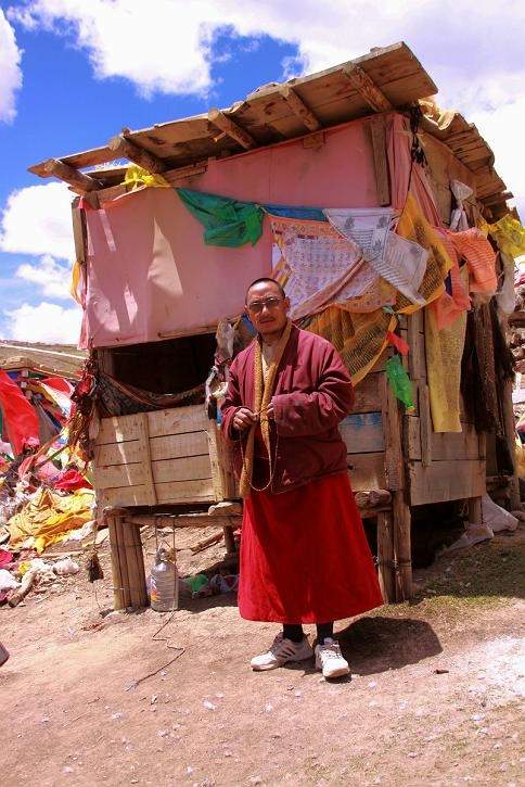 图中右首的小木屋是天葬师的更衣室。正常天葬时间为下午两点,一般天葬师在一点半入场,做点准备工作。两点左右(有时会在2点半),一群喇嘛(我们称为天葬工作者),会将超度完毕的尸体运送到天葬台,摆放完毕后开始诵经,意喻超度。