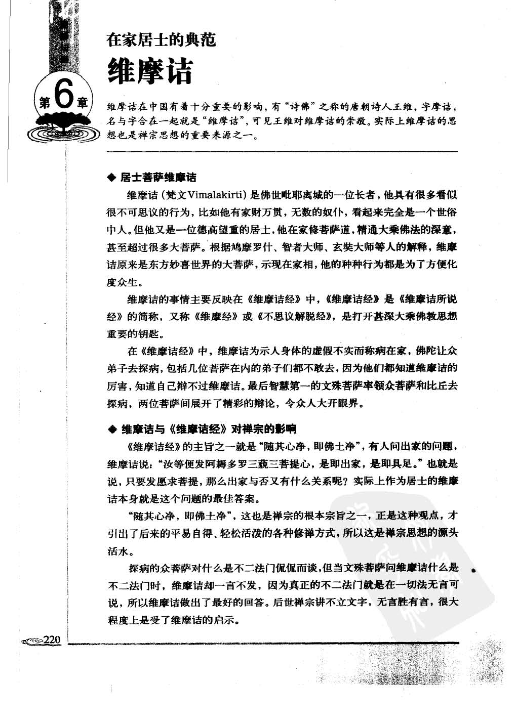 维摩诘在中国有着十分重要的影响,有“诗佛”之称的唐朝诗人王维,字摩诘,名与字合在一起就是“维摩诘”,可见王维对维摩诘的崇敬。实际上维摩诘的思想也是禅宗思想的重要来源之一。 居士菩萨维摩诘 维摩诘(梵文 Vimalakirti)是佛世毗耶离城的一位长者,他具有很多看似很不可思议的行为,比如他有家财万贯,无数的奴仆,看起来完全是一个世俗中人。但他又是一位德高望重的居士,他在家修菩萨道,精通大乘佛法的深意,甚至超过很多大菩萨。根据鸠摩罗什、智者大师、玄奘大师等人的解释,维摩诘原来是东方妙喜世界的大菩萨,示现在家相,他的种种行为都是为了方便化度众生。 维摩诘的事情主要反映在《维摩诘经》中,《维摩诘经》是《维摩诘所说经》的简称,又称《维摩诘经》或《不思议解脱经》,是打开甚深大乘佛教思想重要的钥匙。 在《维摩诘经》中,维摩诘为示人身体的虚假不实而称病在家,佛陀让众弟子去探病,包括几位菩萨在内的弟子们都不敢去,因为他们都知道维摩诘的厉害,知道自己辩不过维摩诘。最后智慧第一的文殊菩萨率领众菩萨和比丘去探病,两位菩萨间展开了精彩的辩论,令众人大开眼界。 维摩诘与《维摩诘经》对禅宗的形响 《维摩诘经》的主旨之一就是“随其心净,即佛土净”,有人问出家的问题,维摩诘说:“汝等便发阿耨多罗三藐三菩提心,是即出家,是即具足。”也就是说,只要发愿求菩提,那么出家与否又有什么关系呢?实际上作为居士的维摩诘本身就是这个问题的最佳答案。 “随其心净,即佛土净”,这也是禅宗的根本宗旨之一,正是这种观点,才引出了后来的平易自得、轻松活泼的各种修禅方式,所以这是禅宗思想的源头活水。 探病的众菩萨对什么是不二法门侃侃而谈,但当文殊菩萨问维摩诘什么是不二法门时,维摩诘却一言不发,因为真正的不二法门就是在一切法无言可说,所以维摩诘做出了最好的回答。后世禅宗讲不立文字,无言胜有言,很大程度上是受了维摩诘的启示。(东方阳熹按:作者愚昧了。经云:“道本无言,言说是妄”,老子曰:“道,可道,非常道”,老子是受了谁的启示啊?)