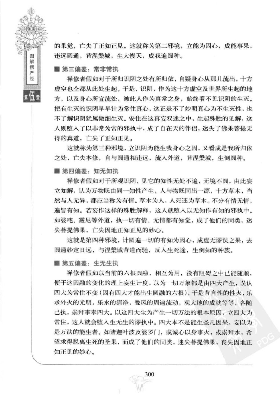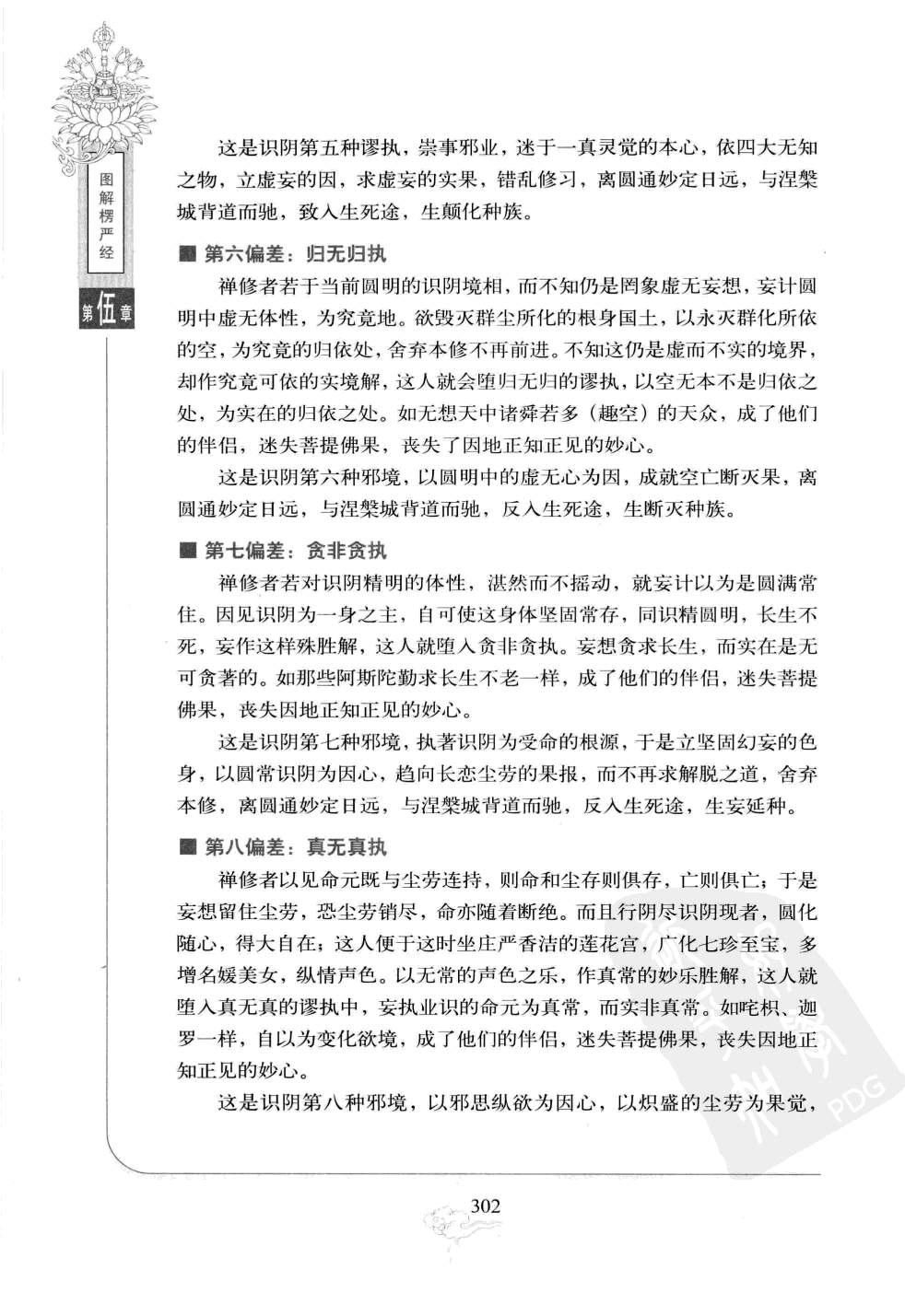 识阴十境中,前八种是外道、天、仙、魔王错修妄本,贪恋尘劳,不出三界,枉受生死。后两种的定性声闻和辟支佛,都已断惑证真,已出三界而了生死,但不知更求无上菩提妙果,以得少为足。 ■ 识阴区宇的境界 佛说,彼善男子修三摩提,行阴尽后,观察诸世间幽隐轻清扰动的根源,十二类生的同分生机忽然隳裂它的沉细纲纽。因此,三界诸趣受生偿业的深脉感应全都悬离隔绝,涅槃性大将大明悟。如同天将晓时公鸡作最后一遍打鸣,瞻视东方已露曙色。六根虚静不再弛逸,内根外尘化为一味湛明之境。内不见有能入之根,外不见有所入之尘,深达十二类生各各受命的原由。观此受命原由,又把它当成本元真心,不受十二类生的牵召。惟见十方世界同是惟识一体变现,识精元明常得现前,能发现暗中之物。这就称为识阴区宇。 如果能在群类既不能召,又见十方世界同是惟识一体变现之中,微密观照,销磨六门,使其分者得合,以六根为一根用,一根能作六根用,互用清净。于是十方世界及身心融合明澈,如琉璃内外明彻,这就称为识阴尽,行者则能于此超越命浊。观察识阴的来由,是以罔象虚无的颠倒妄想作为它的根本。 ■ 第一偏差:因所因执 禅修者能令自己的六根隔碍消磨,合六根为一根之用,开一根为六根之用。也与十方十二类生共通惟一见闻觉知,同归识阴的圆元。假如对于所归依之处妄立真常因,生殊胜之解,那么行者就堕入因所因执,黄发外道所归的冥谛就成了他的同类,他就迷了佛果菩提无得的真道,亡失了自己因地知见的妙心。这违反并远离了圆通,背离了涅槃城,生外道种。 ■ 第二偏差:能非能执 禅修者假如将识阴作为所归依的极果,以识心为自体,于是以为尽虚空界十二类生都是从我身中一类流出,生起殊胜的见解。那么,这人就堕入以非能为能的邪执中,成为自在天摩醯首罗的伴侣,迷失了佛所证菩提的果觉,亡失了正知正见。这就称为第二邪境,立能为因心,成能事果,违远圆通,背涅槃城,生大慢天,成我遍圆种。 ■ 第三偏差:常非常执 禅修者假如对于所归识阴之处有所归依,自疑身心从那儿流出,十方虚空也全都从此处生起。于是,识阴,作为这十方虚空及世界所生起的地方,以及身心所宣流处,被此人作为真常之身,始终看不见识阴的生灭。把有生灭的识阴早早计为常住真心,这正是不了妙明真心为不生灭性,也不了解识阴犹属微细生灭。安住在这真妄双迷之中,生起殊胜的见解,这人则堕入了以非常为常的邪执中,成了自在天的伴侣,迷失了佛果菩提无得的真道,亡失了正知正见。 这就称为第三种邪境,立识阴为能生我身心之因,又看成是我所归依之处,亡失本修,自与圆通相违远,流入外道,背涅槃城,生倒圆种。 ■ 第四偏差:知无知执 禅修者假如对于所观识阴,见它的知性无处不遍,无境不圆,由此妄立知解,认为万物既由同一知性产生,人与物既同出一源,十方草木,当然与人无异,都应当称为有情。草木为人,人死还为草木。不分有情无情,遍皆有知。若妄作这样的殊胜解释,这人就堕入以无知作有知的邪执中。如婆咤、霰尼等外道,执一切有情、无情都有知觉,成了他们的同类,迷失菩提佛果,亡失因地正知正见的妙心。 这就是第四种邪境,计圆遍一切的有知为因心,成虚无谬误之果,去圆通妙定日远,与涅槃城背道而驰,反入生死途,生倒知的种族。 ■ 第五偏差:生无生执 禅修者假如以当前的六根圆融,相互为用,没有阻碍之中已能随顺,便于这圆融的变化的理上妄生计度,以为一切万象都是由四大产生,误认四大为常住不变(因有四大才能出生圆融的六根),干是背自性的性火,乐求外火的光明,乐水的清净,爱风的周遍流动,观大地的成就等等,各随己执,崇拜奉奉四大。以这四大尘为产生一切万法的根本原因,立四大为常住,这人就会堕入生无生的谬执中。四大本不是能生圣凡因果,妄以为是万法的能生者。如诸迦叶波及婆罗门,或诚心以身事火,或崇拜水,希望求得脱离生死的圣果,而成了他们的同类,迷失菩提佛果,丧失因地正知正见的妙心。 这是识阴第五种谬执,崇事邪业,迷于一真灵觉的本心,依四大无知之物,立虚妄的因,求虚妄的实果,错乱修习,离圆通妙定日远,与涅槃城背道而驰,致入生死途,生颠化种族。 ■ 第六偏差:归无归执 禅修者若于当前圆明的识阴境相,而不知仍是罔象虚无妄想,妄计圆明中虚无体性,为究竟地。欲毁灭群尘所化的根身国土,以永灭群化所依的空,为究竟的归依处,舍弃本修不再前进。不知这仍是虚而不实的境界,却作究竟可依的实境解,这人就会堕归无归的谬执,以空无本不是归依之处,为实在的归依之处。如无想天中诸舜若多(趣空)的天众,成了他们的伴侣,迷失菩提佛果,丧失了因地正知正见的妙心。 这是识阴第六种邪境,以圆明中的虚无心为因,成就空亡断灭果,离圆通妙定日远,与涅槃城背道而驰,反入生死途,生断灭种族。 ■ 第七偏差:贪非贪执 禅修者若对识阴精明的体性,湛然而不摇动,就妄计以为是圆满常住。因见识阴为一身之主,自可使这身体坚固常存,同识精圆明,长生不死,妄作这样殊胜解,这人就堕入贪非贪执。妄想贪求长生,而实在是无可贪著的。如那些阿斯陀勤求长生不老一样,成了他们的伴侣,迷失菩提佛果,丧失因地正知正见的妙心。 这是识阴第七种邪境,执著识阴为受命的根源,于是立坚固幻妄的色身,以圆常识阴为因心,趋向长恋尘劳的果报,