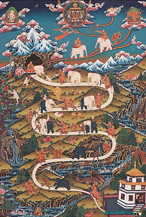从前,我的心四处攀缘,但现在我已经调御内心,如同驯象师制服狂象。飘浮的人,无法证得究竟法喜。藏传佛教中经常用驯象来喻示调心。在藏传佛教寺院的墙壁壁画上有幅《修定图》描述修行者净化心灵成长之图。图用象来比喻学习佛法的几个阶段,意思是说人刚学佛时就像那不羁不驯的黑象一样,思想不开悟,障碍重重,必须加以强制。猴子和火焰是象征佛教哲理中所说的“心”。当魔障和心灵得到了净化,由强制达到了自觉自愿,就和那象的颜色由黑逐渐变白、脾气由暴躁变驯服一样,彻底开悟了。再看看那背景,山脚下水浪翻滚,沿途风光枯燥;而山顶上却是花红柳绿、白云缭绕,星辰日月争辉。 出家人表用功修定的行者,他的钩索表正念,棍表正知,这些是他驯心的工具。大象表心,它的黑色表沉没。猴子表掉举。兔表细微的沉。在路上,有5种修定的进程上令我们分心的东西(色声香味触觉的外境,对应眼耳鼻舌身):一面镜子,表色和色的诱惑。一对乐器,表声和其诱惑。一个装了香水的海螺,表香和其诱惑。水果,表味和其诱惑。一块布,表触和其诱惑。路上有一些火,这些火表四作意。在初修时火比较猛,越往上走,火越小,这指开始修的时候必须用功力度大和很刻意,到后来不必太力度大和很刻意了。 这幅图正是喻示佛教徒修习禅定必经的九个阶段,称为“九住心”。“九住心”亦可称为“九住定”是修习禅定的九个阶次,是初学行者勘验禅定修学进度,最具体、实际的准则。犹如宁玛巴的九乘次第,就像楼梯的台阶。上一个台阶,就会有不同的发现与收获。在玛哈瑜珈阶段,还会注重外在的坛城和供品;到了阿努瑜珈,就根本不强调外在坛城,而仅仅强调自身坛城了;到了阿底瑜伽(大圆满)的时候,心本来就是佛的坛城了,身体只是心的投影与幻像,最关键的还是内心。以下参考《成佛之道》所说,说明如下: 1.内住心 一般人都习惯将心外放,眼睛看到好看的就一直看,耳朵听到好听的就一直听,舌头尝到好吃的就多吃一点,原本清净的心,透过六根一直向外追求,于是本来清净的心就变成染污心、贪欲心、嗔恨心……。习定,即是将散乱心收摄,让心意住在预设的“所缘对象”上,这是习定的第一步,称为“内住”。(行者手拿工具在追象但追不到,这时象被猴拉着跑,二者都为黑色。路上火很猛烈。这是说明在开始的时候,心完全不受控,必须很用力修,而且很用力修也不太见成绩。) 2.续住心 初习定者,虽然将心收摄于所缘对象,但无始来的虚妄心念,会习惯性的想到平日所做的一些事情,所看的一些景物,此时心就跑到所想的人事物上去。经过一段时间后,若忽而“正知”升起,又把心拉回置于所缘对象,可是一会儿又忘记,又想到别的事情,于是心又再次跑掉,经觉照又再拉回,像这样断续不定的来回于所缘对象,是修定的第二步,称为“续住”。(行者手拿工具在追象但还是追不到,象还是被猴拉着跑,但二者黑色少了一点点。这是说明在第二阶段的时候,心能在很短的时段里停驻在所缘上。) 3.安住心 此时,心已较习惯安住于所缘对象,妄念一起,即能发觉,并立刻把心拉回,心较安定,不会常常往外跑,这样的心境,称为“安住”。(行者的钩索绑到象了,象已不再被猴拉着跑,但还是跟着猴子。二者黑色又少了一点点,这时兔出现了,但注意看,在这时,象猴兔开始看向和尚了(前2阶段,象是看着追着猴的!)。这部分图表示在这阶段我们能摄心,心开始有一点点受控了,但一在外界干扰时就心散了)。 4.近住心 心已能安住于所缘对象,对所观之对象虽然还不是很清晰明显,但只要有一念向外攀缘,便能立刻警觉。随时观照于所缘对象,称为“近住”。(和3差不多,但3者白的程度多了。这是说明在这阶段我们能摄心,但一在外界干扰时仍然心散。) 5.调伏心 从摄心向内,而至“近住”,皆是把心扣住在所缘对象上;到调顺的阶段,就会知道修定很好,体验到修禅定的殊胜。例如:看书时理解力慢慢增强,办事时精神较能集中,身也有了变化,心也能常处平静当中。所以身心之情绪变化皆能得到具体的改善。降服烦恼的力量也增强了,对于五欲、三毒、男女相之诱惑等,亦能以静制动,不容易为外境所惑。(现在行者不止钩索绑到象,连棍也出动的很好了,而且是行者拉象而猴子乖乖地拉着象尾巴了,象猴兔半白了。此时仍然有兔。这是说明在这阶段我们基本上已对粗的沉掉有控制了,但细微的还有。) 6.寂静心 “调顺”是克服外境的诱惑,到了“寂静”,是降伏发自内心的杂念。如:曾经看过的录影带、电影、杂志图片、或思念乡里、国家等寻思。五盖──贪欲、嗔恚、惛沉睡眠、掉举恶作、疑。对这些,也能以内心的安定功德克制它了,不易再受它的扰乱。至此,内心是寂静了。寂静,如深夜的寂然无声一般,并非是涅槃的寂静,行者应知!(兔不见了,表细微的沉也受控了,但仍然有细微的掉举。这时象猴的白的程度已过一半了。注意这时火很小了,表示这时候只间歇用力保持定就足够了。) 7.最极寂静心 上面的寂静,还是以静定来制伏寻、伺等烦恼的,如以石头暂时把草压住,但被压住的草还蠢动著,并非烦恼心念全不现起了。现在已进步到,寻伺等一起,即立刻遣除。前四住心,是安住所缘的过程。但修止成定,主要是为了离欲恶不善法,所以定力一强,从五住到七住,就是降伏烦恼的过程。必静而又净,才能向正定迈进。(