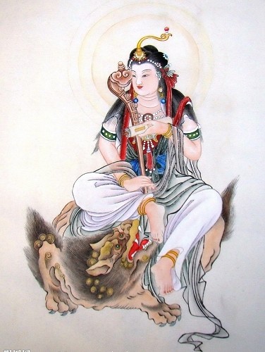 大圣文殊菩萨,不独建立道场于五台山,摄化有缘人,同时深入民间,示同凡人,随机说法,普度众生。如佛教中著名的寒山大士,就是文殊菩萨应世。还有中国宋朝时代,有戒阇黎者,亦文殊菩萨的化身。 顿吉出家为“善戒” 传记:宋朝台州临海县,有一长者名娄原佑,乐善好施,其父官拜少卿,亦仁慈爱物。其夫人张氏,夜梦月光入怀,后怀孕生子,取名顿吉。顿吉出世即言:“善哉父母,生我劬劳,长度群生,为世沃焦。”父母闻言大惊,既忧且喜。有一天,小儿忽请其母,准备七人斋饭,果然不久,七个和尚共来。其父原佑合掌请问:“大德何来?”其中一人答道:“我等是从南印度来,闻居士生奇子,特来相贺。”饭后,抱儿相见,僧对儿言:“仁者有情之轨,切莫被他蒙过,须要惺惺。”儿乃抚掌而笑,僧去后,小儿对父母言:“刚才七人,都是佛菩萨化现人间。” 顿吉五岁时,自称六和大师。十五岁辞别父母去出家,在杭州道上,遇见慧光和尚,说明出家意念。老和尚介绍彼去飞来峰,见波利多尊者,尊者问:“子从何来?”答:“从缘来。”问:“是何姓?”答:“是佛性。”问:“子身尚俗,安识佛性?”答:“我身虽俗,因俗证真,真俗圆融,洞然无二,无二之性,即是佛性。”波利多尊者,异其根利,为之落发出家,受具足戒,名之为“善戒。”自此,云游四方,广度众生。但行为怪诞,异于常人。知人所不知,能人所不能。 渡口叱五郎神 淳熙二年,戒师与弟子普明,道全等人,由五台山同往潼州,有一渡口,名化生渡。对岸有一神庙,是五郎祠。五郎神时常显灵,令乡人每天杀猪宰羊致祭,五郎神知戒师必经此道,化虎挡住去路,戒师知虎是五郎神所变,以手格虎让路,来到五郎祠,指神像叱曰:“汝是一郎至五郎,妄兴祸福宰牛羊,老僧为说无生法,免至冤家累世偿。”五郎神像立即塌坏,五郎祠亦无火自焚。乡人惊骇不已。邪神显灵,妄兴祸福,愚人无知,杀生祈福,人神获罪,世人不觉。无世无人,无地不有,如来说为可怜愍者,若非菩萨威神之力,五郎神等,仍然执迷造业,妄兴祸福咧!敬希读此文者,普为劝化,功德无量。 驱魔救李光弼 淳熙三年,戒师来到洛阳,洛阳有一富家名李光弼,常听信妖言,沉迷邪魔,戒师憨其愚,为邪魔所惑,亲到其家,端坐入慈济三昧。众魔各自现形,皆是邪魔外道,甚至牛神鬼怪之类。向师哀求:“乞为开导。”戒师曰:“汝等众魔妖精,性本妙明,从今以后,不要再害生灵。”众魔感恩而逃,李家自此安宁,而李光弼亦皈依三宝,正信佛法。 黄牛和尚 一日,戒师去参黄牛萨多波那和尚,因和尚常骑黄牛,当时人都称彼为黄牛和尚,即日戒师见黄牛和尚骑牛而来,抚掌于途道:“披毛戴角汉!”萨多和尚即答道:“笑杀老瞿昙,打破曹溪祖。”戒师大喝一声:“披毛带角,我向你道,一张大犁,任你拽倒。” 黄牛和尚大笑而去。 人不行善死后为犬 淳熙四年,戒师来到杭州天竺山,行人禅师,勤修止观,与师同里而住,两人交往,颇为相得。行师告戒师道:“我要回台州兜率院,我们一齐去好么?”戒师一听,很高兴道:“好!” 他们两人结伴同行,来到绍兴居住旅馆,店主王伯恭见二师结伴而来,向前顶礼恸哭,戒师惊问何故?店主答道:“先君小祥。”戒师道:“你知道你父亲死后往生何处?”王伯恭道:“弟子不知,愿和尚慈悲,指示我父,所生之处。”戒师回头对行人禅师道:“这事怎么办?”行师道:“救诸有情,今正是时。” 戒师即呼其家犬到面前来道:“汝身虽异,本性昭然。” 说也奇怪,那只家犬一听戒师的话,忽然泪下,而且开口对王伯恭道:“我是你父,以罪业故,受此报形。”伯恭道:“既是我父,作何罪业,而遭此报呢?”其犬道:“我平生不信佛法,诬坏善人,自己不行布施,看见他人行布施,用言阻止,也不让人家布施。因此遭此报,愿汝念父子之情,哀求二师慈悲,为我说法得脱此形。” 王伯恭知道家犬就是父亲投生变的,顿足哀号,恳求二师救他父亲,戒师对着狗子说法道:“心随境转,业花敷茂,心空境寂,业花自寂;罪无定罪,业非真业,心邪则业风自生,心正则业风自止,皆由汝心,非他所授。” 犬闻法后,至晚不食而死。伯恭因此也求戒师为他落发出家,法名道稠,追随戒师行化四方。行人禅师,专修弘净土,誓愿众生,同生极乐。 让屠夫放下屠刀 淳熙六年,戒师经过一处,见一屠夫名金炳,正缚着一头羊,欲举刀刺杀,羊咩咩哀叫不已。戒师说道:“你两脚不修,遭此活剥。”谨此二句话,羊不叫了,屠夫也不杀了。戒师开示曰:“人成羊,羊变人,只在转瞬间。一切众生,无不曾作父母兄弟,男女眷属,易生而受禽畜之身,云何于中取而食之?汝等从冥入冥,报此躯壳,吃他八两,还他半斤,若能返妄归真,从冥入明,脱此躯壳,应当归依三宝,永不杀生。”金屠夫听罢,放下屠刀,舍妻出家,忏悔罪业,戒师为其披剃受戒,法名可化。 后来可化欲往天台山参石桥禅师,路遇强盗,被众强盗拦截痛殴,可化大叫“冤家痛哉。”群盗笑言:“正是冤家。”将可化缚于树上,欲活剥其皮,这时有一盗首走来,追问经过道:“他是出家人,那里有钱,杀他无用,放他去吧!”可化死里逃生,不敢前往,退回戒师处,将经过告戒师。师说:“若无老僧救你,定还他八两了。”可化始知盗首,正是戒师变身。 台州降雨 原来绍熙四年,台州大旱,黎民百姓,祈祷神祇,不获感应,反而炎阳更烈。当时太守,将城隍庙神像搬出曝晒,责其不能泽而救民。夜梦神言:“汝知龙属,职司行雨,若无天命勒令,是不敢自专