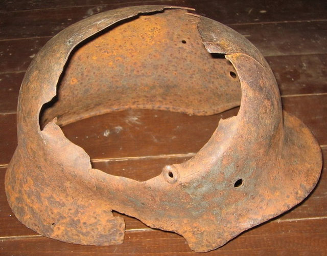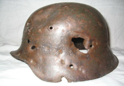 这顶头盔也是俄罗斯某私人收藏家的藏品。头盔是从地下挖出来的,表面同样有弹孔。虽然其质量比通常见到的德军头盔更低劣,但可以保证它是真品。说这句话的原因在于,波兰人伪造二战头盔已经很久了(自60年代开始)。