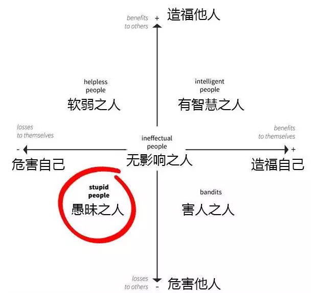 东方阳熹按: 西方人的思维方式与东方人有很大的不同,上面那张图的意思是说: “有智慧之人”趋向于造福自己,造福他人; “软弱之人”趋向于造福他人,危害他人; “害人之人”趋向于造福自己,危害他人; “愚昧之人”趋向于危害自己,危害他人。 其实愚昧和智慧,通常取决于个人看问题的角度。比如在一般人眼里,弱智者才是愚昧的,而在佛的眼里,凡众都是愚昧的。 无明和业力的驱使,是使人变得愚昧的根本原因;而认心修心,奉行十善,则是走向智慧和觉悟的开端! 根据官方统计,《中国有1亿精神病》,由此可见,中国人的业力是多么的深重,是多么的需要佛法和圣贤教育。但是在这个群体,圣贤却得不到尊重,大多数人都在肆意的诋毁宗教,亵渎佛法,辱骂、嘲讽孔子等古圣先贤,这是多么可悲的现象!
