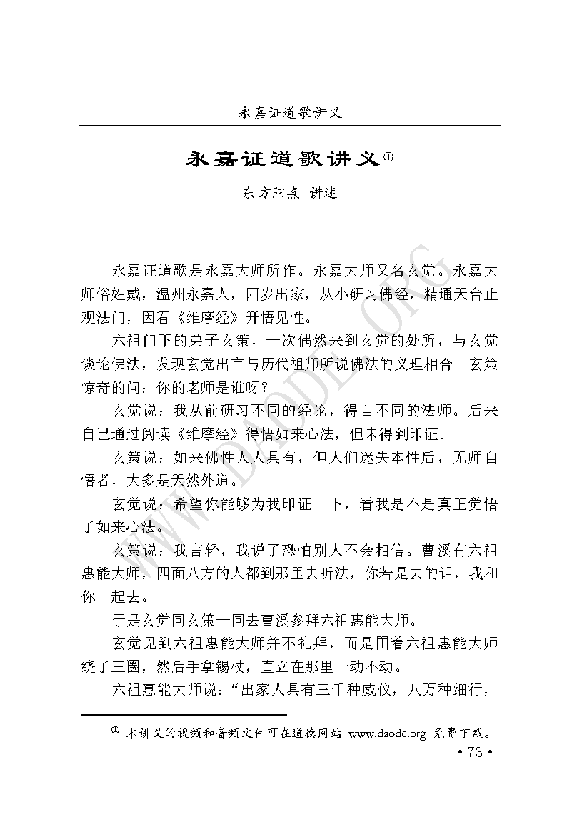 六祖门下的弟子玄策,一次偶然来到玄觉的处所,与玄觉谈论佛法,发现玄觉出言与历代祖师所说佛法的义理相合。玄策惊奇的问:你的老师是谁呀?