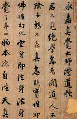 | 温州永嘉玄觉禅师者。永嘉人也。姓戴氏。丱岁出家。遍探三藏精天台旨。观圆妙法门。于四威仪中。常冥禅观。后因左溪朗禅师激励。与东阳策禅师。同诣曹溪。初到振锡携瓶。绕祖三匝。祖曰。夫沙门者。具三千威仪八万细行。大德自何方而来生大我慢。师曰。生死事大无常迅速。祖曰。何以体取无生。了无速乎。曰体即无生。了本无速。祖云。如是如是。于时大众。无不愕然。师方具威仪参礼。须臾告辞。祖曰。返太速乎。师曰。本自非动岂有速耶。祖曰。谁知非动。曰仁者自生分别。祖曰。汝甚得无生之意。曰无生岂有意耶。祖曰。无意谁当分别。曰分别亦非意。祖叹曰。善哉善哉。少留一宿。时谓一宿觉矣……。
