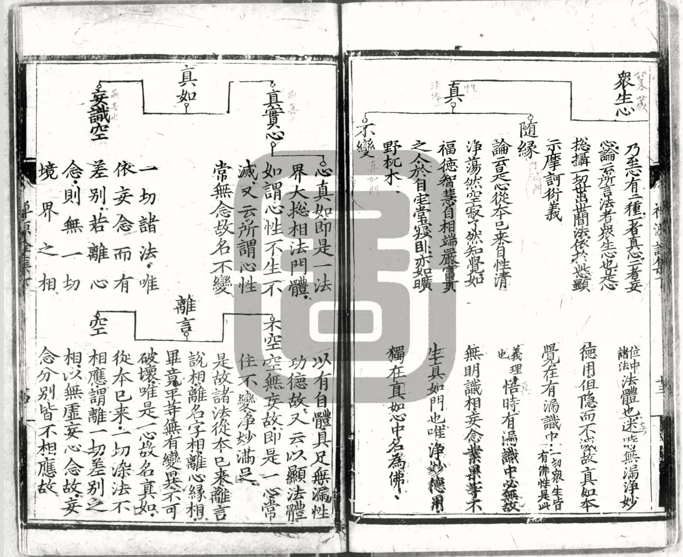 禅源诸诠集卷下上之三教。摄尽佛一代所说之经。及诸菩萨所造之论。细寻法义。便见三义全殊。一法无别。就三义中。第一第二空有相对。第三第一性相相对。皆条然易见。唯第二第三破相与显性相对。讲者禅者同迷。皆谓同是一宗一教。皆以破相便为真性。故今广辨空宗性宗有其十异。一法义真俗异。二心性二名异。三性字二体异。四真智真知异。五有我无我异。六遮诠表诠异。七认名认体异。八二谛三谛异。九三性空有异。十佛德空有异。初法义真俗异者。空宗缘未显真灵之性故。但以一切差别之相为法。法是俗谛。照此诸法。无为无相。无生无灭。无增无减等为义。义是真谛。故智度论以俗谛为法无碍辩。以真谛为义无碍辩。性宗则以一真之性为法。空有等种种差别为义。故经云。无量义者从一法生。华严十地亦云。法者知自性。义者知生灭。法者知真谛。义者知俗谛。法者知一乘。义者知诸乘。如是十番释法义二无碍义。皆以法为真谛。以义为俗谛。二心性二名异者。空宗一向目诸法本源为性。性宗多目诸法本源为心。目为性者诸论多同。不必叙述目为心者。胜鬘云。自性清净心。起信云。一切法从本以来离言说名字心缘等相。乃至唯是一心。楞伽云。坚实心。良由此宗所说本性不但空寂而乃自然常知。故应目为心也。三性字二体异者。空宗以诸法无性为性。性宗以灵明常住不空之体为性。故性字虽同。而体异也。四真智真知异者。空宗以分别为知。无分别为智。智深知浅。性宗以能证圣理之妙慧为智。以该于理。智通于凡圣之灵。性为知。知通智局。上引问明品已自分别。况十回向品说真如云。照明为性。起信说。真如自体真实识知。五有我无我异者。空宗以有我为妄。无我为真。性宗以无我为妄。有我为真。故涅槃经云。无我者名为生死。有我者名为如来。又云。我计无我是颠倒法。乃至广破二乘无常无我之见。如春池执砾为宝。广赞常乐我净而为究竟。乃至云无我法中有真我(良由众生迷自真我。妄执五蕴为我。故佛于大小乘法相及破相教中破之云无。今于性宗直明实体。故显之云有也)。六遮诠表诠异者。遮谓遣其所非。表谓显其所是。又遮者拣却诸余。表者直示当体。如诸经所说真妙理性。每云。不生不灭。不垢不净。无因无果。无相无为。非凡非圣。非性非相等。皆是遮诠(诸经论中。每以非字非却诸法。动即有三十五十个非字也。不字无字亦尔。故云绝百非)。若云知见觉。照灵鉴光明。朗朗昭昭。惺惺寂寂等。皆是表诠。若无知见等体。显何法为性。说何法不生灭等。必须认得见今了然。而知即是心性。方说此知不生不灭等。如说盐云不淡是遮。云碱是表。说水云不干是遮。云湿是表。诸教每云绝百非者。皆是遮词直显一真。方为表语。空宗之言但是遮诠。性宗之言有遮有表。但遮者未了。兼表者乃的。今时学人皆谓。遮言为深。表言为浅。故唯重非心非佛。无为无相。乃至一切不可得之言。良由但以遮非之词为妙。不欲亲自证认法体。故如此也(悟息后即任遮表临时)。七认名认体异者。谓佛法世法一一皆有名体。且如世间称大不过四物。如智论云。地水火风是四物名。坚湿暖动是四物体。今且说水。设有人问。每闻澄之即清。混之即浊。堰之即止。决之即流。而能溉灌万物洗涤万秽。此是何物(举功能义用而问也)。答云。是水(举名答也)。愚者认名便谓已解。智者应更问云。何者是水(征其体也)。答云。湿即是水(克体指也。此一言便定更无别字可替也。若云水波清浊凝流是水。何异他所问之词)。佛法亦尔。设有人问。每闻诸经云。迷之即垢。悟之即净。纵之即凡。修之即圣。能生世间出世间一切诸法。此是何物(举功能义用而问也)。答云。是心(举名答也)。愚者认名便谓已识。智者应更问。何者是心(征其体也)。答知即是心(指其体也。此言最的。余字不如。若云非性非相能语言运动等是心者。何异他所问词也)。以此而推水之名体。各唯一字。余皆义用。心之名体亦然。湿之一字贯于清浊等万用万义之中。知之一字亦贯于贪嗔慈忍善恶苦乐万用万义之处。今时学禅人多疑云。达摩但说心。荷泽何以说知。如此疑者。岂不似疑云比只闻井中有水。云何今日忽觉井中湿耶。思之思之。直须悟得水是名不是。湿湿是水不是名。即清浊水波凝流。无义不通也。以例心是名不是知。知是心不是名。即真妄垢净善恶。无义不通也。空宗相宗为对。初学及浅机。恐随言生执。故但标名而遮其非。唯广以义用而引其意。性宗对久学及上根令忘言认体。故一言直示(达摩云。指一言以直示。后人意不解寻思。何者是一言。若云即心是佛是一言者。此是四言。何为名一也)。认得体已。方于体上照察义用。故无不通矣。八二谛三谛异者。空宗所说世出世间一切诸法不出二谛。学者皆知。不必引释。性宗则摄一切性相及自体总为三谛。以缘起色等诸法为俗谛。缘无自性诸法即空为真谛(此与空宗相宗一谛。义无别也)。一真心体。非空非色。能空能色。为中道第一义谛。其犹明镜。亦具三义。镜中影像。不得呼青为黄。妍媸各别。如俗谛影无自性一一全空。如真谛其体常明。非空非青黄。能空能青黄。如第一义谛。具如璎珞大品本业等经所说。故天台宗依此三