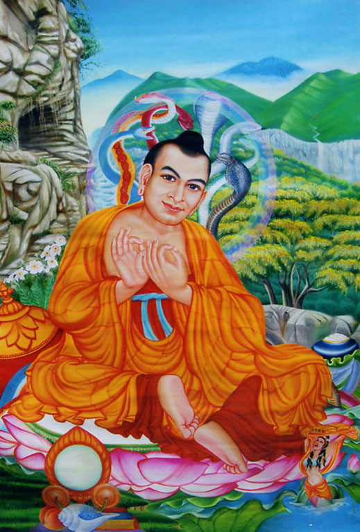 龙树是大乘佛学的创始人,生于约公元二至三世纪,是南印度的婆罗门种姓, 传说其父姓龙,母生他于树下,故名龙树。 龙树天资特别聪明,在孩提的时候,听到婆罗门诵读经典,数遍之后,他即能背诵。到二十岁以后,对天文、地理、数学,以及婆罗门和各道的经文,几乎都读遍了,而且理解力相当强,因此在青年时名气就很大。 他有几个同龄好友,都是学识超群。一天,大家议论道:我们把天下的经论都理解了,现在就是没有学到法术,不能纵情逸乐。不久打听到一个术士,会隐身术,他们就去登门求教。那术士看到他们年轻,又动机不良,不愿传授。他们苦苦请求,术士缠不过他们,只得给每人一粒药丸,嘱告道:“你们在僻静的地方,用水将药丸磨化,涂在眼睛周围,人们就见不到你们了。”龙树便当场试磨,细辨药丸的气味,对术士道:“你共用了七十样药物合成,对吗?”术士不胜惊讶,问他怎么知道。龙树说:“我是从气味中辨别出来的。”术士甚为叹服,只得叮咛要慎用此术。 龙树等四人仗着隐身术,从此常出入宫中,恣情取乐。百余日后,宫中的一些美女,竟有人怀孕了。国王大为忿怒,严加责问。妃子们哀泣说:“非是我们不贞,是睡梦中有妖人作弄。”国王召大臣商议。一老臣说:“凡这等事有两种可能,一是鬼魅作崇,一是术士捣乱。陛下可派几个精明的人,暗暗分守在宫门背后,若是术人,总有迹象可露,可用兵器除之;若是妖魅,虽无迹象,亦可用符咒消灭。”国王立即照办。 不久有人来报,是术士所为。国王当即派武士数百人,禁闭宫门,手挥刀剑,望空乱砍。三个婆罗门术士被杀死了,惟有龙树药性未过,没有现形,又屏气凝神躲在国王背后,终于逃脱了性命。 受此严重教训后,龙树方才觉醒,想到了佛陀所说:“贪欲是众苦与祸患的根本,一切败德丧命之事,皆由此引起。”于是下了归依佛门的决心。他寻到一座山上的佛塔,向一位沙门虔诚请求,出家受戒。他在佛塔待了九十多天,读遍了所有经论,心不满足,但已无其它经文可得。他辞师下山,又访寻到北印度雪山的一座佛塔,向一位老比丘恳求,得到了《摩诃衍》大乘经典,他用心研究求教。三个月后,他又统统理解并背熟了,仍感不满足,于是就周游列国,搜集沙门的各种经论。一路上,他还和诸外道及部派佛学者辩论,都辩不过他。他逐渐产生了骄傲,认为佛经较诸外道,其理虽然高明深奥,但亦不难穷尽,不能满足我的要求。他就萌生非分之想,别出心裁,欲另自立一派,广收徒弟,宣扬他的学说。 正在这时,有一位叫大龙的比丘,长髯突眼,目光炯炯,特来找他。对他说:“年轻人啊,你不能持井蛙之见,你的学识再高能超过佛陀吗?你且跟我到一个地方,让你看看大乘经典,你再下结论吧。”这位大龙比丘就把他领到一个深山的石洞,入洞数步,竟是另外一个世界,殿宇金碧辉煌,清静雅致。老比丘把他领入龙宫,打开一个个玉石宝库,里面藏着数不尽的稀世经典,宝库里发出阵阵幽香。大龙比丘说:“年轻人,这下够你读了吧?”龙树忙不迭地贪婪翻阅,口里说道:“长老,我太感谢你了!” 这下龙树真的满足了,比过去读到的多十倍,玄理更加精妙深奥,他如饥似渴地昼夜阅读,不明之处随时就向龙师请教,视野顿时开阔,心量也开始谦虚了。至此他才真正地感到,佛学浩如烟海,其理博大精深,没有任何外道超得过它,够我一生用心钻研了。同时也就打消了自立门户的陋见。 他在龙宫待了很久,把所藏的经典反复细阅,几乎能背诵了。大龙长老又授予他一些神通术,他才别师出来,仍回到南印度。从此大力宣扬佛法,说服外道,推广大乘佛教。被他感化的婆罗门等外道,不计其数。 当时有位婆罗门上师,会一点咒术,心生嫉妒,欲与龙树比个高下。他奏明国王,请王以观究竟。国王规劝他:“我看你虚心一点吧,龙树已是一位得道高僧,和多年前大不同了,他明与日月争光,智与圣心并照,你为什么不能容他呢?” 婆罗门说:“陛下被他巧言迷惑了,我谅他没有什么真本事,如若不信,看我们比试吧。”国王见他固执,只得准奏。 比赛的那天,国王与龙树先坐在听政殿上。婆罗门后到,他见国王如此尊重龙树,心中更是不悦,便于殿前立即作法,只见现出一个广大洁净的黄金池子,水波粼粼,中央升起一株千叶莲花,那婆罗门高坐其上傲慢地说:“龙树,你看我坐在莲花之上,宛如天神,而你屈居地下,卑微可笑,你敢与我莲上的大德智人辩论吗?” 龙树也不答言,从容地离开座位,用咒言化作一头庞大的六牙白象,自坐其上,绕黄金池子一周;然后举步池中用象鼻把那婆罗门高高举起,摔于地下,莲池与白象瞬间隐去,惟见那婆罗门腿折腰伤,一副可怜之相。他自知非龙树对手,匍匐于地,叩首恳求:“恕我不自量力,毁辱大师,伏请多谅!从此愿意归依佛门,开我愚蒙,求大师收我为弟子。” 印度又有一个邻国,国王笃信外道,并强迫其臣民亦信奉外道;对沙门释子,则非平等对待。龙树闻之,特前往宣扬佛法。其时该国正在招募国王卫士,龙树应募,很快升为校卫。他在短时期内,帮助整顿队伍,严明纪律,使国王的卫队面貌一新。一日国王出巡,龙树率领卫队荷戟前行,彩旗招展,步伐整齐,威风凛凛。国王见了甚是满意,便问侍者带队的是什么人,侍者答:“此人奇怪得很,不吃王家一口饭,也不要王家一文饷银,说是来保护国王,整饬军纪。”国王亦觉奇怪,就召他晋见。问道:“你是什么人?”龙树答:“我是一切智