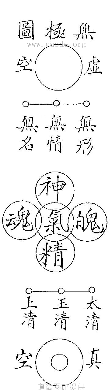 老君曰:大道无形,生育天地。大道无情,运行日月。大道无名,长养万物。注:老君曰。老者乾阳也,君者性王也,曰者说谈也。 夫老君之出,莫知其原,自混沌以来,无世不出,上三皇号万法天师,中三皇号盘古神王,后三皇号郁华子,神农时号大成子,轩辕时号广成子。千变万化,难以尽推。或化儒圣,或化释佛,或化道仙,隐显莫测。或著感应,或著道德,或著清静,功德以无边。 大道无形者,大为无外,道为至善,无是无极,形是踪迹。夫大道,本鸿濛未判之元气,有何形质之见焉? 生育天地者,生为生化,育为含养,天为阳气,地为阴气。而天地何由大道之生也,每逢戌亥二会为混沌。混沌者,无极也,以待子会之半,静极一动而生阳。阳气上浮为天,在人为玄关。以待丑会之半,动极一静而生阴。阴气下凝以为地,在人为丹田。故曰:天开于子,地辟于丑也。 大道无情者,夫道本属先天,无声无臭;情本属后天,有作有为。无情是无为之道也。 运行日月者,运是旋转,行为周流,日为金乌,月为玉兔。日属离卦,则有寒暑之来往。月属坎卦,则有消长之盈亏。在人为圣日圣月,照耀金庭。 大道无名者,名是名目。先天大道,无形无象,有何名字,强名曰道。 长养万物者,长为长生,养为养育,万物是胎卵湿化昆虫草木之类,皆得先天之气而生者也。世人若肯回头向道,访求至人指示身中之天地,身中之日月,修无形、无情、无名之道,炼神宝、气宝、精宝之丹,返上清、太清、玉清之宫,证天仙、金仙、神仙之果,逍遥物外,浩劫长存,这等好处,何乐而不为也? 木公老祖诗曰: 文昌帝君诗曰: |