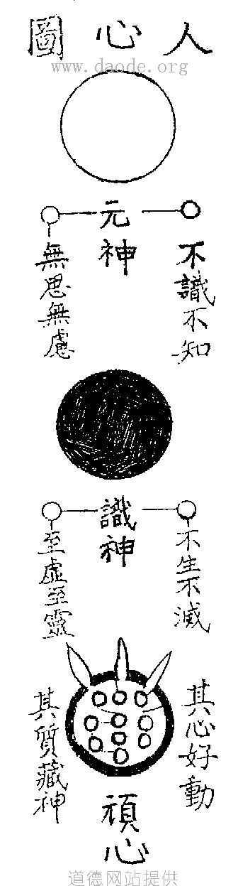 夫人神好清,而心扰之。 注:夫人神好清者。一阴一阳乃为人,人得一为大,大得一为天,超出天外,方为夫字。人者,得天气下降,地气上升,阴阳相结,以为人也。神者,禀父母之性为元神,受天地之性为识神。而元神无识无知,能主造化;识神最显最灵,能应变无停。此神是人之主人翁,而其神之原,出于无极,道家呼为铁汉,释氏唤作金刚,儒家叫做魂灵,不生不灭,不增不减,在身为魂,出身为鬼,修缮为仙为佛,作恶变禽变兽。夫元神,随身之有无,从受胎以得其生,凝于无极之中央,主宰生身之造化,十月胎足,瓜熟蒂落,地覆天翻,一个筋斗下地, 好者爱也,清者静也。此言元神本好清静,无奈人心之识神而好动作,时常以扰之,不能清静。因不能清静,朝伤暮损,渐磨渐亏,元神一衰,而百病相攻,无常至矣。奉劝世人,要晓人身难得,中华难生,佛法难遇,大道难逢。今得人身,幸生中华,切莫糊糊混混,以过一世,要把性命二字为重,识神、元神当分,真身、假身当晓,人心、道心当明。切不可以人心当道心,以识神当元神,以假身当真身。 佛经云心字诗: 吕祖曰: 黄老诗曰: 太白星诗曰: |
