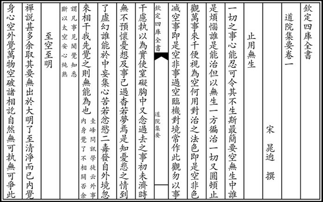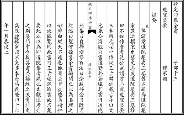 提要臣等谨案《道院集要》三卷,旧本题为《道院集》,宋·晁迥撰。宋史艺文志载《道院集要》三卷注曰:不知作者。考晁公武读书志载《道院集要》三卷,称元佑中侍从王古编并载,古序曰:文元晁公博观内书,复勤于著述其书,曰《道院别集》,曰《自择増修百法》,曰《法藏碎金》,曰《随因纪述》,曰《髦智余书》。余尝编阅之,以为名理之妙,虽白乐天不逮也,辄删去重复,总集精粹,以便观览。则此书乃王古选录,迥书,故名《集要》。此本以为即《道院集》者,误也。文献通考列之别集门中,今检其书,乃语录之流,实非文集,改隶释家,庶不失其本旨焉。乾隆四十六年十月 恭校上。 总纂官(臣)纪昀 (臣)陆锡熊 (臣)孙士毅 总校官(臣)陆费墀
