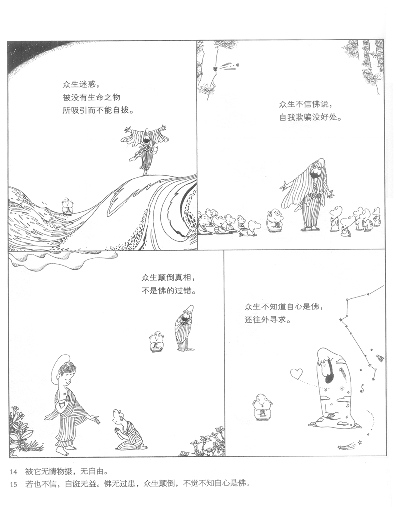 14 被它无情物摄,无自由(一切存在皆空无自性。不仅仅是“没有生命之物”,包括人类自身等一切的生命形式,皆属无情物,人们若对其产生执著,就会被人我、生死、善恶、得失、好坏、是非等分别见所束缚,失去心灵的自由)。