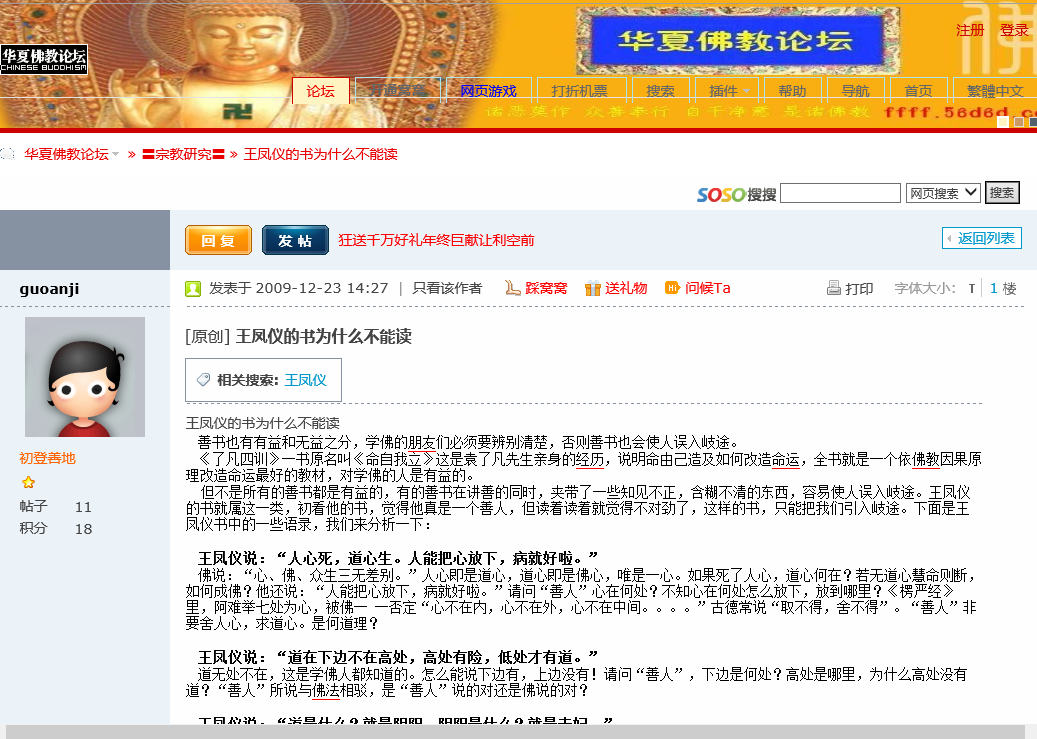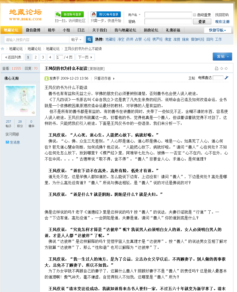 以下是guoanji(郭安吉)在“地藏论坛”和“华夏佛教论坛”发表的诽谤王凤仪善人的言论: