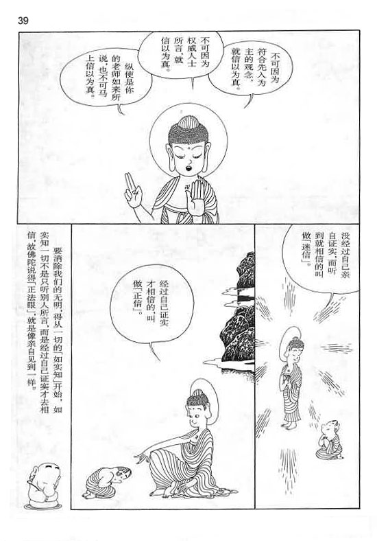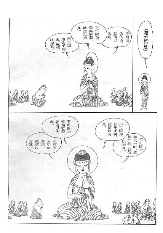 希望读者仔细看一下上面这两幅图中的文字,然后再反思一下自己人生所认定的东西,看看有多少是属于理性的,有多少是属于非理性的?有多少是自心证实的,有多少属于知识见解?有多少属于正信,有多少是迷信……。 不仅是释迦牟尼佛教导我们,要思考,要印证真理,不要迷信,圣人孔子在《中庸》中也同样教导我们:“博学之,审问之,慎思之,明辨之,笃行之。”。问题是,我们一代又一代的人,接受了圣人的教导吗?我们对自己认定的人生观、价值观、宗教信仰,进行过反思吗? 下面,我来列举一些学佛修道者容易犯的错误…… 一、羊群效应:因为大家都这么做,所以这么做肯定是有道理的、是正确的,要不然大家也就不这么做了。我跟着这么做,肯定没错,即使错了,错的也不是我一个人,反正大家都错。 这就是为什么真理总是掌握在少数人手里,总是少数人获得成功的原因。因为,多数人相信的东西,多数人所选择的方向,未必是正确的。 二、曾参杀人:曾参的母亲非常信任自己的儿子曾参,当外面传言曾参杀人的时候,曾母第一次听到时,坚决不信;第二次听到时,开始怀疑;第三次听到时,就信以为真了。世间没有比做母亲更了解自己儿子,更信任自己儿子的了,但做母亲的听到三次传言后,信念也动摇了,可见传言对人的作用是多么大。反观我们自己所听到的一切,所了解的一切,有多少是道听途说得来的,又有多少是经过自心证实的? 世间的各种非真理性理论,不就如同“曾参杀人”的传言一样吗? 三、迷信经典:种种法为种种心,没有种种心,何须一切法。佛以方便智说方便法。《金刚经》云:“所谓佛法者,即非佛法。”,“意思就是本来就没有佛法,不过假以开悟众生,取一个名字叫佛法而已!故云所谓佛法者,即非佛法。” 由此可知,佛法是假的,是似有实无的。人们迷于经典,迷于文字,而不悟自心,就是被经转,就是被虚妄所迷。 心是活的,法是死的;心是真的,法是假的。人们在证道之前,因为自己不具有明辨真伪的能力,所以要通过持诵《金刚经》等最上乘经典,访求善知识,指引性真。人们在证道之后,就要抛弃一切经典,一切成见,用自心去衡量一切,评判一切。 四、迷信权威:当一群羊迷失方向时,他们就会找出一只领头羊给他们带路。这群羊在领头羊的带领下,因为方向一致,走的是同一条道路,所以声势浩大,他们在心理上不仅不再感到孤单,而且还能够获得安全感。正是基于这种心理的需求,即使领头羊出现了错误和偏差,这群羊也还是心甘情愿的追随。何况,大多数羊是懒得考虑方向对错的,他们只知道跟着羊群一起走,埋头吃草而已……。但是,如果领头羊不识道路,或领错了道路,就成了一盲引众盲,最终只能是群羊覆没。 当今的宗教信仰者,大多是靠心外的东西增强内在的信心,例如加入宗教组织的人越多,赞扬的人越多,承认他们的人越多,他们的信心就越坚定,反之他们就会六神无主。这些人就如同羊群一样,结盟组织,加入组织,不过是为了相互依存,获得自信心和安全感而已……。 其实,真正的自信,坚定的信念,是无法通过心外的事物获得的。人们唯有通过内心的真参实悟——正信,才能够得以树立。 ……。 以上种种,限于文字,难以一一俱说。总之,人们要想证得一切真理,需从怀疑一切开始。人们迷信经典,迷信权威,心外获得的一切理论,一切的说教,凡是未经自心证实的,无异于道听途说。 一个人在没有开悟见性以前,无论在家出家,修行了多少年,阅读了多少经典,充其量只是一个真理的听闻者,而不是真理的实践者。 《金刚经》云:“未悟之时,须凭言说,已悟之后,言说皆非。”。经云:“开口即是妄,落笔即是假。”又云:“言语道断,心行处灭。”。由此可知,正信非从外得,非从语言文字获得,也就是说,正信并非源于经典,源于能言善辩,源于权威人士,源于宗教……。 正信,源于每个人自心对真理的实践和证实,而无关心外的一切。 写于:2007年10月01日