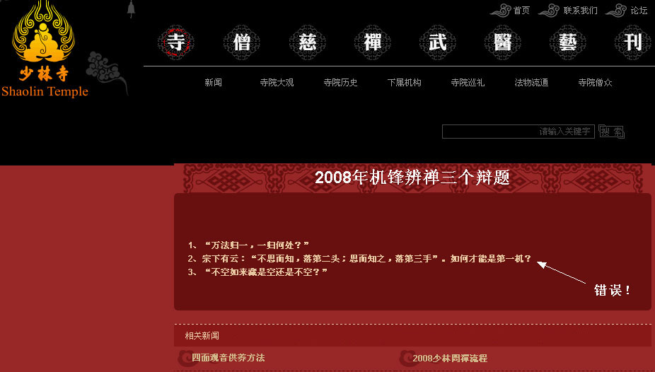 少林寺举办的“2008年机锋辨禅三个辩题”如下: 1、“万法归一,一归何处?” 第二题:“宗下有云:‘不思而知,落第二头;思而知之,落第三手’。如何才能是第一机?”,出题者将“不思而知”作了分别,故此题有误。 “不思而知,落第二头;思而知之,落第三手。”源于《唐袁州仰山慧寂传》,此句原文是:“思而知之落第二头。云不思。而知落第三首。” 释慧寂。俗姓叶。韶州须昌人也。十七岁出家,初谒耽源,已悟玄旨,后参沩山,问如何是真佛住处,沩山云:“以思无思之妙,返思灵焰之无穷,思尽还源,性相常住,事理不二,真佛如如。”于言下顿悟。自此执侍,前后十五载。 僖宗帝乾符六年,还袁州大仰山张化门,故以仰山之名为世知。唐昭宗大顺二年卒,年七十七。仰山继其师沩山之旨,师徒共创沩仰宗……。 慧寂禅师深通无相无为般若,其讲法传道,直指人心,处处破执。《唐袁州仰山慧寂传》中记载有这样一个案例:“时韦冑就寂请伽陀。乃将纸画规圆相。圆围下注云。思而知之落第二头。云不思。而知落第三首。乃封呈达。” 此文大意是说:韦冑向慧寂禅师请求偈语予以开示。慧寂禅师在纸上画了个“〇”,并在“〇”相下面写到:“思而知之落第二头。云不思。而知落第三首。”然后将此信封上,呈送给对方。 “〇”即无极、心、道、如来佛性。“〇”空无一物,不落于语言文字,然而却是一切思想意识和见闻觉知的总能源。 真空无相。起心即是妄,有二即非真,“思而知之”,已失心之本体,落于后天,故云“落第二头”。“二头”即两边。 “佛法是不二之法”。无心亦无念,无念何知心?心是念体,念是心用;无心亦无思,无思亦无心;心即是思,思即是心;此为不二。“云不思。而知落第三首。”是说,若是断灭思想,即落顽空,此是落第三方。“首”,在这里是位次的意思,如:左首、上首。 心是一真的存在。非有非无,非色非空,非念非无念,非思非无思,不落两边,不落中间,是谓一真。人们执著有无,是落于两边;执著心相、涅槃相、或顽空,是落于中间。六祖惠能大师在《坛经·机缘品第七》中说:“不作涅槃解。二边三际断。”即是此意。“不作涅槃解”是说不能著于心相,“二边三际断”是说要断除两边和三首(中间)的执著。 后有不识经义者,主观臆断,将“思而知之落第二头。云不思。而知落第三首。”肆意改为“不思而知,落第二头;思而知之,落第三者。”,还有将其最后一句改为“落第三首”和“落第三手”者。没想到这条被人曲解的禅机语,不但没有受到批评和澄清,反被照搬照用,竟然出现在少林寺举办的“2008年机锋辨禅三个辩题”当中。此不仅有辱先圣先贤和佛教文化,亦是对末法时期佛教界的极大讽刺……。 当今佛教界以非为是,以旁为正,以曲为直,以讹传讹的说法随处可见,真不知害了多少学佛者的慧命! 下面让我来详细解释“机锋辨禅”第二题:“宗下有云:‘不思而知,落第二头;思而知之,落第三手’。如何才能是第一机?”为什么是错误的…… 心不是顽空。心虽然无形无相,空无一物,但却是一切思想意识和见闻觉知的总能源。心与念是相对待而产生,无心亦无念,无念亦无心;心即是念,念即是心;心即是想,想即是心;心即是知,知即是心;体即是用,用即是体;此为不二。 无心亦无知,无知亦无心;知即是心,心即是知;故“不思而知”即是本觉。 觉性(心)有体有用。“不思而知”是体用不二,此同于经中所说的“常应诸根用,而不起用想;分别一切法,不起分别想。”。出此题者不明空色不二,体用不二的道理,不但错将“不思而知”进行了分别,还在分别上产生了“落第三手”的第三种分别,真是贻笑大方! 经云:“起心即是妄,有二即非真”。从心的本体来说,“第一机”(即道、心),是不能用语言文字回答的,因为“言语道断,心行处灭”,凡起心动念、落于语言文字者,皆是二,而非“第一机”。从“机锋辨禅”的性质而论,出题者无非是让人们通过语言文字解答问题,由此可以断定,此题并不存在机中机,而是一道错题! “不思而知”就是道之本体,即是一,并没有“落第二头”,出题者自分别,才产生了“落第二头”。既然“不思而知”即是道的本体,除此之外,更寻找什么“第一机”?按照出题者的逻辑,难道说把“不思而知”,即见闻觉知给断了,才是第一机吗? 六祖惠能大师云:“不离见闻缘,超然登佛地。”又云:“无相者,于相而离相;无念者,于念而无念;无住者,人之本性。”又云:“真如即是念之体,念即是真如之用。”又云:“于诸境上,心不染,曰无念;于自念上,常离诸境,不于境上生心。若只百物不思,念尽除却,一念绝即死,别处受生,是为大错。” 由此可知,在相离相,在念离念,即是心之本体,即“第一机”。若把思、知、念、相给断绝了,心亦断绝,即落顽空。 以下是本人对少林寺“机锋辨禅”三道题的解答: 第一题:“万法归一,一归何处?” 答:一归一处。 解释:“万法归一”,一即是心,心即是一。心本来自在,故心无所归。若言“一归心”、“归原”,是心生分别。因此说,针对“一归何处”的提问,回答“一归一处”,是比较圆满的。 第二题:宗下有云:“不思而知,落第二头;思而知之,落第三手”。如何才能是第一机? 答:知者是第一机。(思者是第一机,也对。) 解释:前面已经论述,此题有误。虽然此题存在错误,但并非不能圆满回答。无心亦无知,无知亦无心;