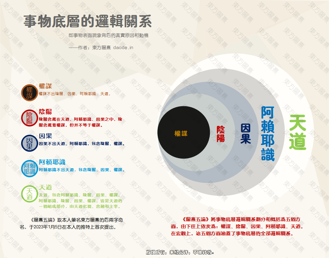 二、《阳熹五论》是何种理论,及理论价值: 《阳熹五论》是阐述事物底层逻辑关系的思想理论,也是一种有关社会行为模式的全新理论。 《阳熹五论》的核心价值,在于其完整阐述了事物底层的全部逻辑关系。人类行为和事物表象背后的真正原因和动机,都能从《阳熹五论》中找到合理的解释。 《阳熹五论》将事物底层逻辑关系划分和概括为五个方面,由下往上依次为:权谋、阴阳、因果、阿赖耶识、天道。在宏观上,这五个方面涵盖了事物底层的全部逻辑关系。 什么是事物的底层逻辑关系?事物的底层逻辑,也就是事物存在、运行、发展的内在原因,或者说人类行为和事物表象背后的真正原因和动机。 事物的底层逻辑关系存在于五个方面,也就是说,事物的出现和发展是由五个方面构成的。人们对事物底层逻辑关系的无知和认知缺陷,必会造成单一、片面的执著,导致决策性失误,出现事与愿违、难以挽回的灾难性后果。 从宏观上讲,真正影响、作用、决定、改变社会现象和人类行为的,不出权谋、阴阳、因果、阿赖耶识、天道这五个方面,人类唯有对这五个方面具有完整的认知,才算是没有缺漏的智慧。但在现实当中,大多数人对事物底层逻辑关系的认知是不完整、片面、偏颇、错误的,这也是造成今生和来世苦难的主因。 人生和事业的失败,主要源于智慧和修养的缺失。一些人在官场、职场、商战中,最终事与愿违,弄巧成拙,一败涂地的主要原因,是因为他们对事物底层逻辑关系缺乏全面的认知,由片面执著造成的。 人们对权谋、阴阳、因果、阿赖耶识、天道的单方面认知,其实是一种智慧的缺陷,既然智慧存在缺陷,那么人们在宏观决策和事物判断上必会造成偏歧和失误,这种偏歧和失误所造成的恶果,有些会在短期呈现出来,有些会报在来世。 以片面执著法家、兵家者来说,由于这些人不知或忽略了其它方面的底层逻辑关系,导致他们片面地认为权谋高于一切、智慧决定一切,若是出现败局,其首先想到的是自己布局和谋算出现了失误。其实决定事物最终成败的因素包含多个方面,不仅包含着日中则昃,月盈则亏的阴阳辩证关系,而且包含着因果、业力、潜意识、天意等多方面的原因,怎可单一而论?! 再拿片面执著天性者来说,这种人往往倾向于顺乎自然,率性而为,抵触和反感一切权谋手段。殊不知,天道不仅以无为方式存在和运行着,一切现象和有为手段同样是无为的体现。也就是说,无为就是有为,有为即是无为。若失之天道,无为也是有为;若不失天道,有为亦是无为。 (一)、在学术方面: 在学术方面,《阳熹五论》不仅从根本上解决了人类千百年以来争论不休的性本善、性本恶、性本自私的问题,同时也化解了术家、道德家、法家、儒家各自的偏歧和相互矛盾,从宏观上完美解释了人类行为和社会现象的本质和动因。 一些人认为天道、法性属于出世法,权谋、阴阳、因果等属于世间法,《阳熹五论》不是将世间法和出世间法混为一谈了吗?殊不知世间法和出世间法本来不二,一即一切,一切即一,心不起二元分别,何来出入之分? (二)、在人性方面: 通过《阳熹五论》对天道的讲解,可以得知人的本性原本是无善、无恶、无我、无私的,因为人落于后天,被万有万相所迷,遗失了本性,才有了我执,并由我执缘起了自私,产生出善恶、好坏、人我、是非等种种的主观好恶和分别。 (三)、在利益和博弈方面: 在利益方面,无论是个人还是天下,认知事物的全部底层逻辑关系,要比单方面的认知,能够获得更大、更多、更稳定、更持久、更长远的利益。 在博弈方面,对《阳熹五论》的全面认知,能够使人获得更大的胜算。 (四)、在个人命运方面: 从个人命运、社会地位,及获取资源的能力来说,一个人若无冥愆或恶业牵绊,其精通《阳熹五论》中的任何一个方面,都能够在社会上脱颖而出,获得较多的资源。反之,若是对《阳熹五论》中的各个方面都不通,又不能本分行事,其大多是命运不济之人,这种人即使生来富贵,也会由于无道行为和智慧的不足,难保手中的一切。 (五)、在行为模式和价值观方面: 1.通过《阳熹五论》,人们可以找到完美的行为模式; 2.通过《阳熹五论》,人们可以从宏观上对人类行为和社会现象得到全面的解释; 3.通过《阳熹五论》,人们可以发现自己认知的片面性和局限性, 4.通过《阳熹五论》,人类会由此产生全新的价值观和行为模式。 5.若是人人认知《阳熹五论》,人类文明和社会发展必将上升到一个新的高度。 6.深入理解《阳熹五论》,会发现此不仅是人类行为的指导性理论,也是人类大同,世界实现永久和平的基础性理论。 (六)、在人材识别方面: 中国现存最早的一部识别人材、选用人材的著作,是三国时期刘劭所著的《人物志》,按《人物志》以兼才、偏才划分人材,在《阳熹五论》中,凡不知天道者,皆可视为偏才;明天道而兼通权谋、阴阳、因果、阿赖耶识者为兼才;五者全通者,非神圣所不能。 不明天道,良心泯灭,而精通权谋的偏才,其能力越大,对民众和社会的危害就越大,死的就越惨,来生就越暗淡。 明天道的兼才,能力大者,可以经邦济世,成为豪杰之人物;能力弱者,即使不能建功立业,亦不会对民众和社会造成危害。 若按《人物志·流业》的十二种人材:清节家、法家、术家、国体、器能、臧否、伎俩、智意、文章、儒学、口辩、雄杰划分